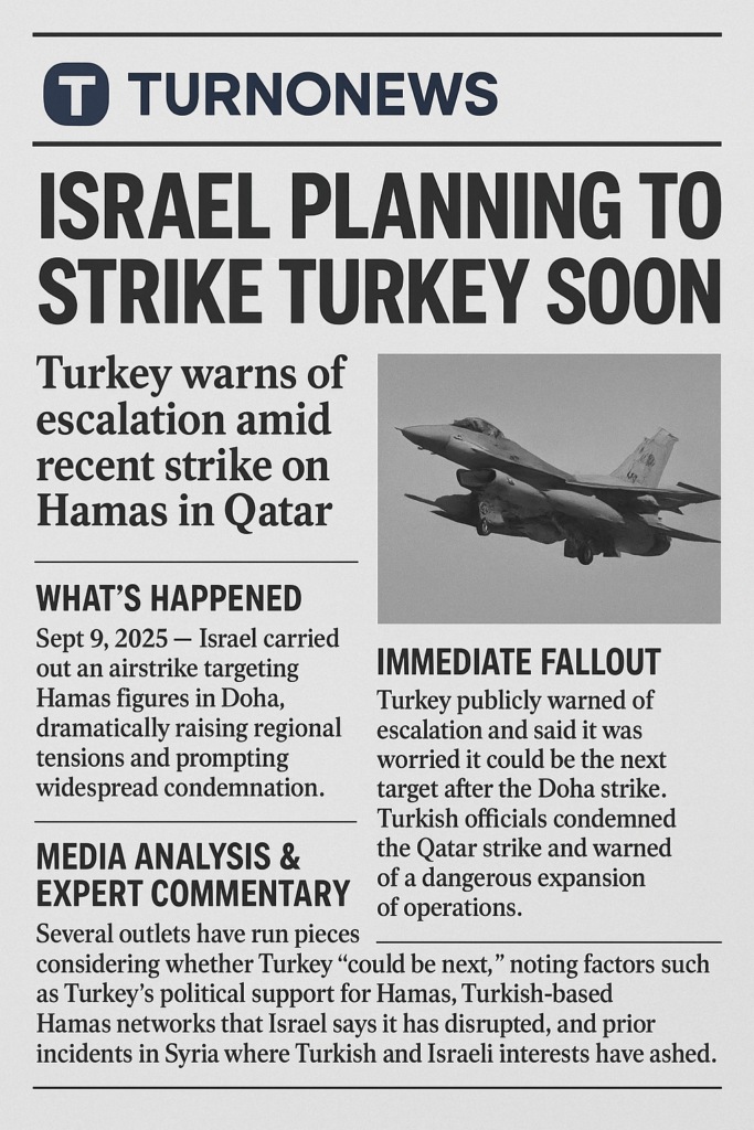Short answer: There’s no public, verifiable evidence that Israel has already decided to “strike Turkey soon.” What’s happening is a sharp escalation of rhetoric and concern after Israel’s strike on a Hamas meeting in Doha (early September 2025), and Turkish officials and many outlets are warning Ankara could be at risk — but reporting so far describes fears, warnings, and analysis, not a confirmed Israeli plan to attack Turkish territory.