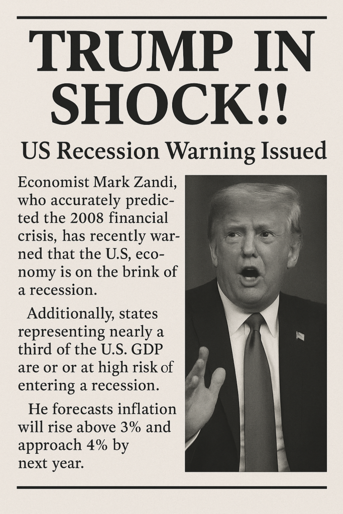 Yes, economist Mark Zandi, who accurately predicted the 2008 financial crisis, has recently warned that the U.S. economy is on the brink of a recession. According to Zandi, states representing nearly a third of the U.S. GDP are currently in or at high risk of entering a recession. He also forecasts that inflation will rise above 3% and approach 4% by next year .www.ndtv.com+1