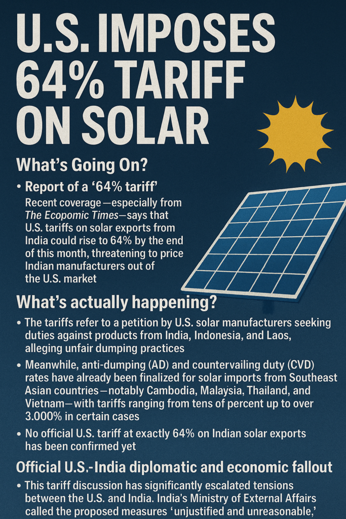 - No official U.S. tariff at exactly 64% on Indian solar exports has been confirmed yet.