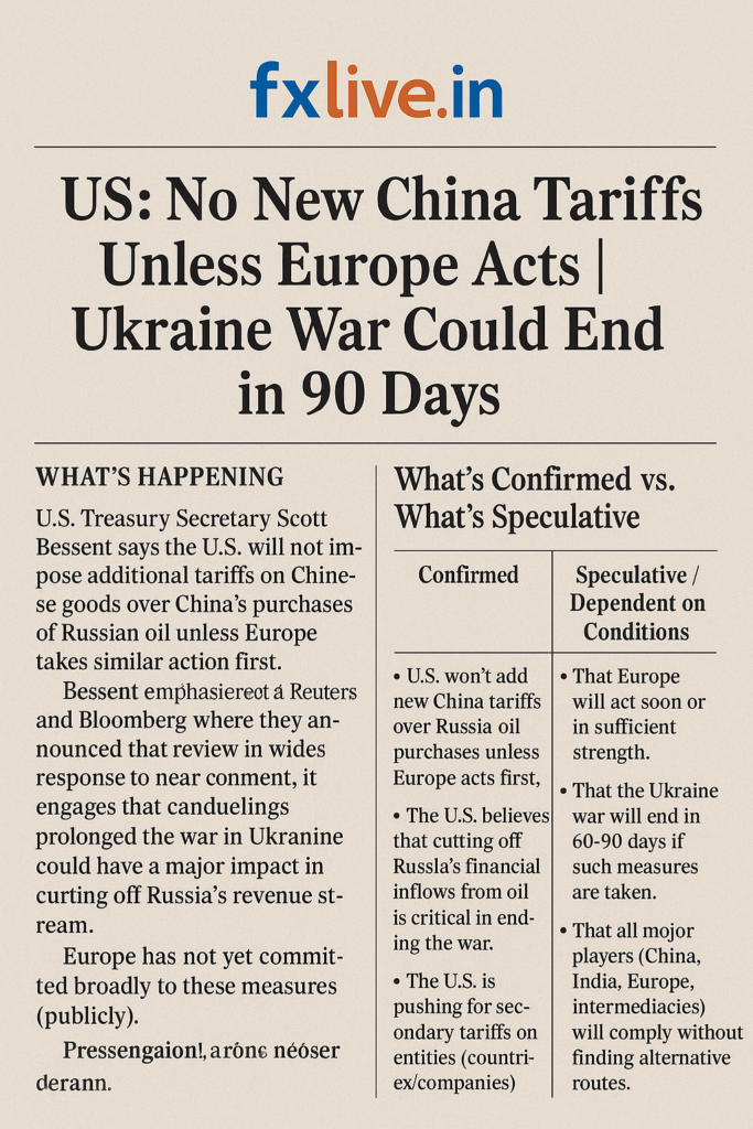 - U.S. Treasury Secretary Scott Bessent has stated that the U.S. will not impose additional tariffs on Chinese goods over China’s purchases of Russian oil unless Europe takes similar action first.
