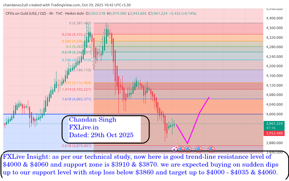 FXLive Insight: as per our technical study, now here is good trend-line resistance level of $4000 & $4060 and support zone is $3910 & $3870. we are expected buying on sudden dips up to our support level with stop loss below $3860 and target up to $4000 – $4035 & $4060.