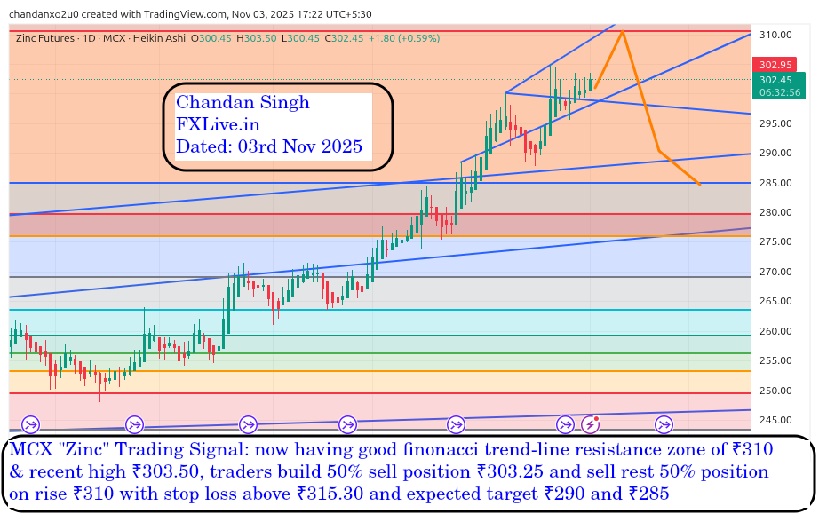 MCX “Zinc” Trading Signal: now having good finonacci trend-line resistance zone of ₹310 & recent high ₹303.50, traders build 50% sell position ₹303.25 and sell rest 50% position on rise ₹310 with stop loss above ₹315.30 and expected target ₹290 and ₹285