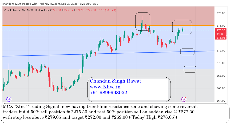 MCX “ZInc” Trading Signal: now having trend-line resistance zone and showing some reversal, traders build 50% sell position @ ₹275.30 and rest 50% position sell on sudden rise @ ₹277.30 with stop loss above ₹279.05 and target ₹272.00 and ₹269.00 ((Today’ High ₹276.05))