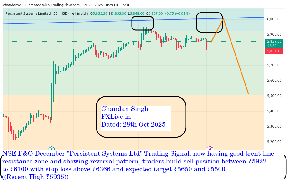 NSE F&O December “Persistent Systems Ltd” Trading Signal: now having good trent-line resistance zone and showing reversal pattern, traders build sell position between ₹5922 to ₹6100 with stop loss above ₹6366 and expected target ₹5650 and ₹5500 ((Recent High ₹5935))