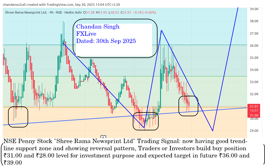 NSE Penny Stock “Shree Rama Newsprint Ltd” Trading Signal: now having good trend-line support zone and showing reversal pattern, Traders or Investors build buy position ₹31.00 and ₹28.00 level for investment purpose and expected target in future ₹36.00 and ₹39.00