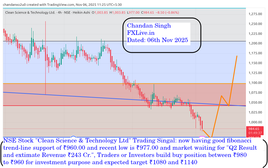 NSE Stock “Clean Science & Technology Ltd” Trading Singal: now having good fibonacci trend-line support of ₹960.00 and recent low is ₹977.00 and market waiting for “Q2 Result and extimate Revenue ₹243 Cr.”, Traders or Investors build buy position between ₹980 to ₹960 for investment purpose and expected target ₹1080 and ₹1140