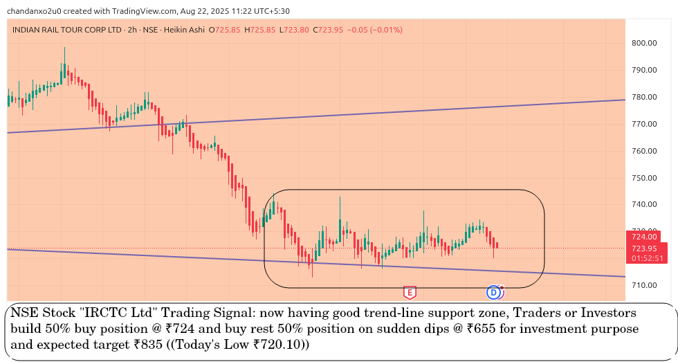 NSE Stock “IRCTC Ltd” Trading Signal: now having good trend-line support zone, Traders or Investors build 50% buy position @ ₹724 and buy rest 50% position on sudden dips @ ₹655 for investment purpose and expected target ₹835 ((Today’s Low ₹720.10))