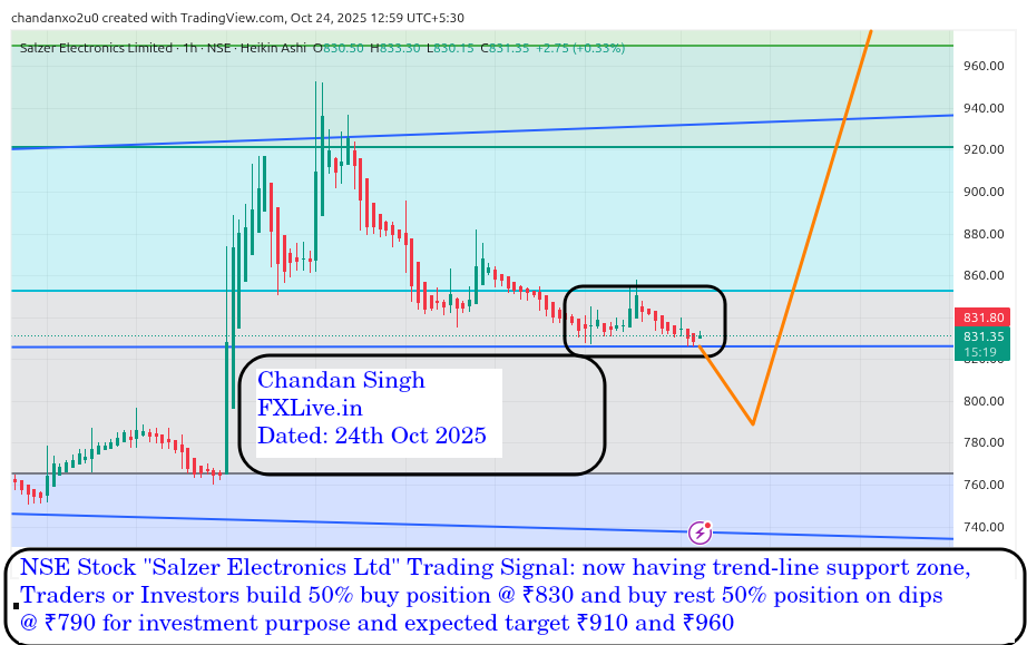 NSE Stock “Salzer Electronics Ltd” Trading Signal: now having trend-line support zone, Traders or Investors build 50% buy position @ ₹830 and buy rest 50% position on dips @ ₹790 for investment purpose and expected target ₹910 and ₹960