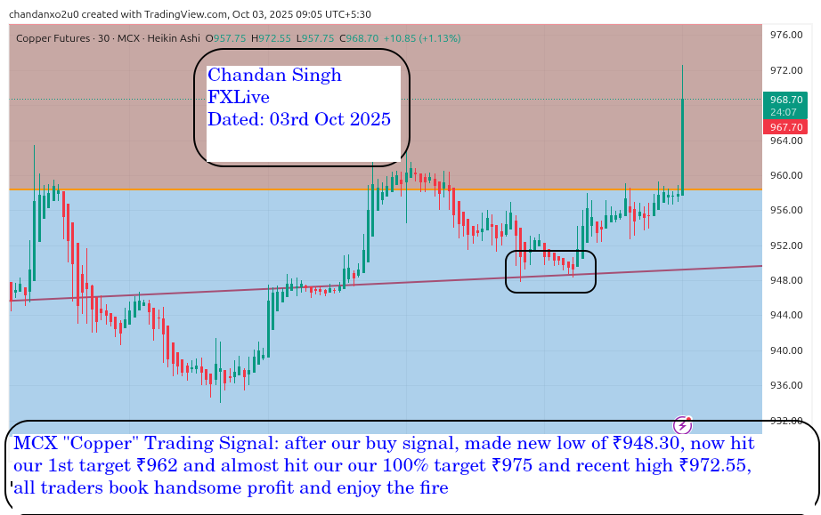 MCX “Copper” Trading Signal: after our buy signal, made new low of ₹948.30, now hit our 1st target ₹962 and almost hit our our 100% target ₹975 and recent high ₹972.55, all traders book handsome profit and enjoy the fire