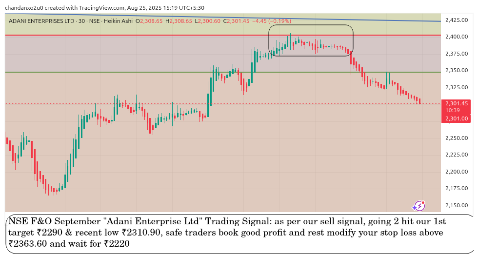 NSE F&O September “Adani Enterprise Ltd” Trading Signal: as per our sell signal, going 2 hit our 1st target ₹2290 & recent low ₹2310.90, safe traders book good profit and rest modify your stop loss above ₹2363.60 and wait for ₹2220