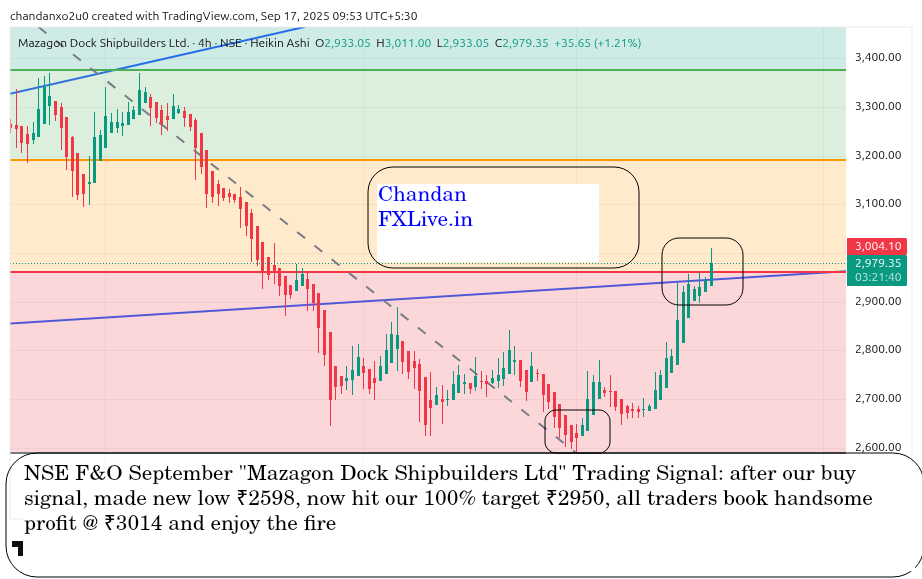 NSE F&O September “Mazagon Dock Shipbuilders Ltd” Trading Signal: after our buy signal, made new low ₹2598, now hit our 100% target ₹2950, all traders book handsome profit @ ₹3012 and enjoy the fire
