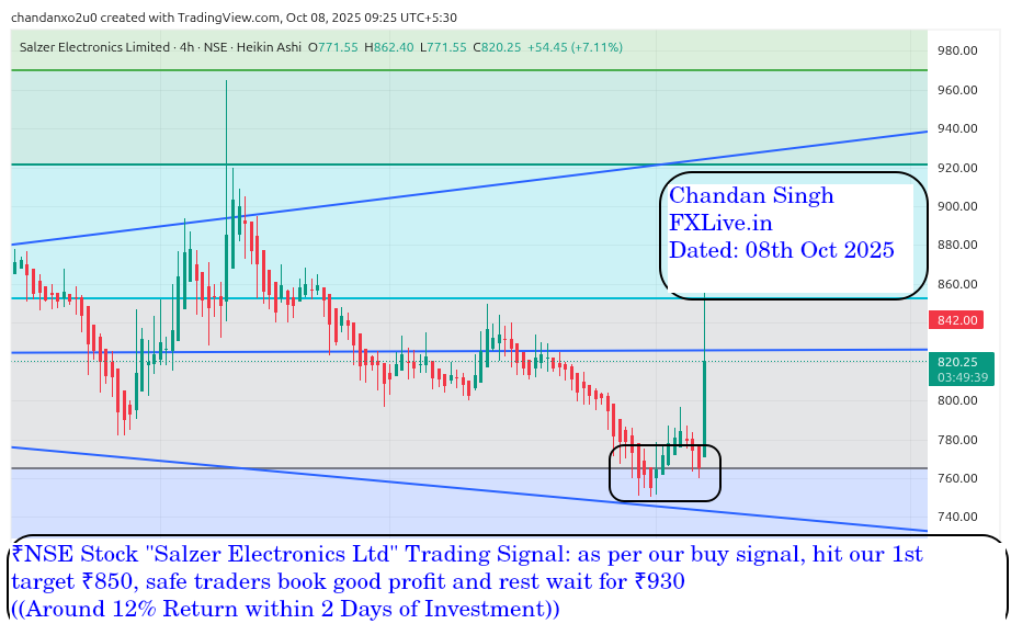 NSE Stock “Salzer Electronics Ltd” Trading Signal: as per our buy signal, hit our 1st target ₹850, safe traders book good profit and rest wait for ₹930 ((Around 12% Return within 2 Days of Investment))