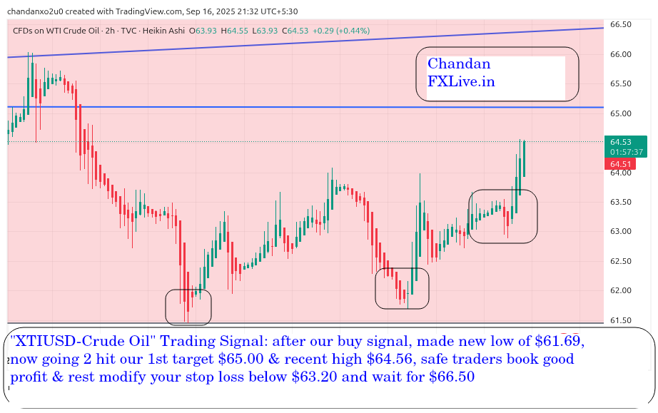 “XTIUSD-Crude Oil” Trading Signal: after our buy signal, made new low of $61.69, now going 2 hit our 1st target $65.00 & recent high $64.56, safe traders book good profit & rest modify your stop loss below $63.20 and wait for $66.50