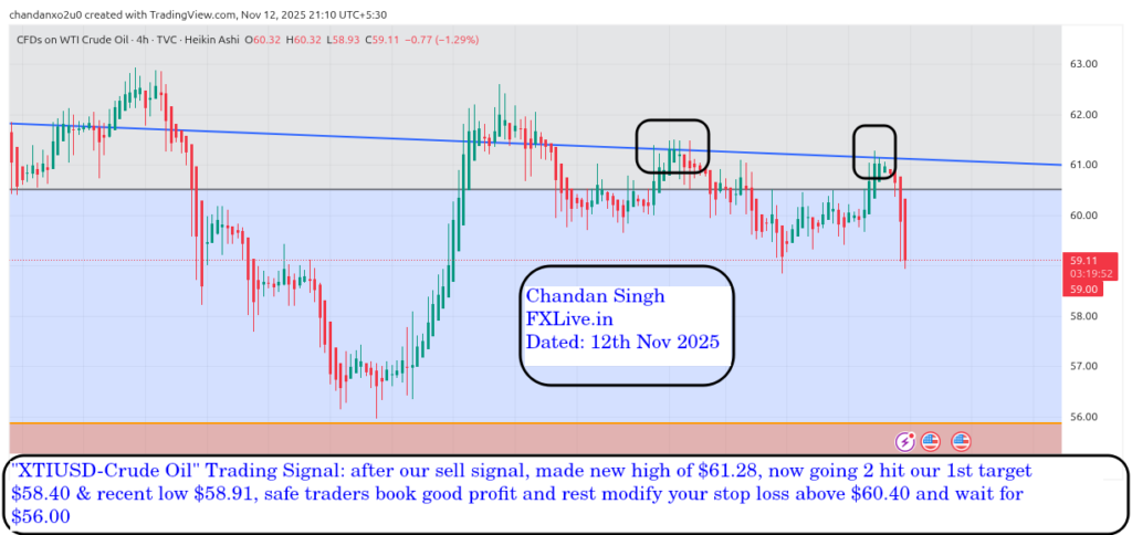 “XTIUSD-Crude Oil” Trading Signal: after our sell signal, made new high of $61.28, now going 2 hit our 1st target $58.40 & recent low $58.91, safe traders book good profit and rest modify your stop loss above $60.40 and wait for $56.00